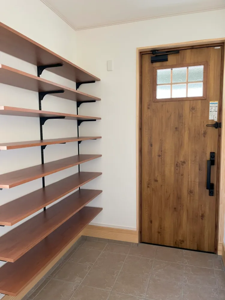 白を基調に明るい玄関ホールになりました。 絨毯貼りの急な階段をゆったりにするために、少し手前に出し、 リビング入口をドアから引戸へ。 魅せる収納で、収納のなかった玄関の不満を解消しました!