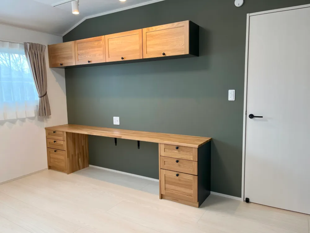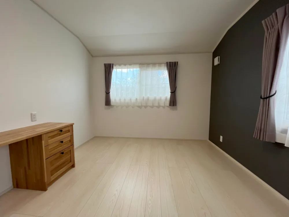 2Fは部屋を思い切って1部屋減らし、それぞれの個室に完全に仕切らないWICを繋げました。 多目的に使用できるデスクを造作し、寝るだけではない心地よい寝室に仕上げました。